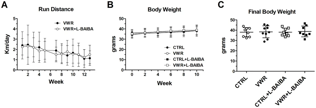 Researchers at the University of Missouri and Indiana University studied 12-month-old male C57BL/6 mice—a model of middle age—and assigned them to four groups for three months: sedentary control; exercise via voluntary wheel running (VWR); L-BAIBA alone (100 mg/kg/day in drinking water); or VWR plus L-BAIBA. Mice ran an average of roughly 1.8 km per day, and running distances and body weights were similar between the VWR and VWR+L-BAIBA groups throughout the study.