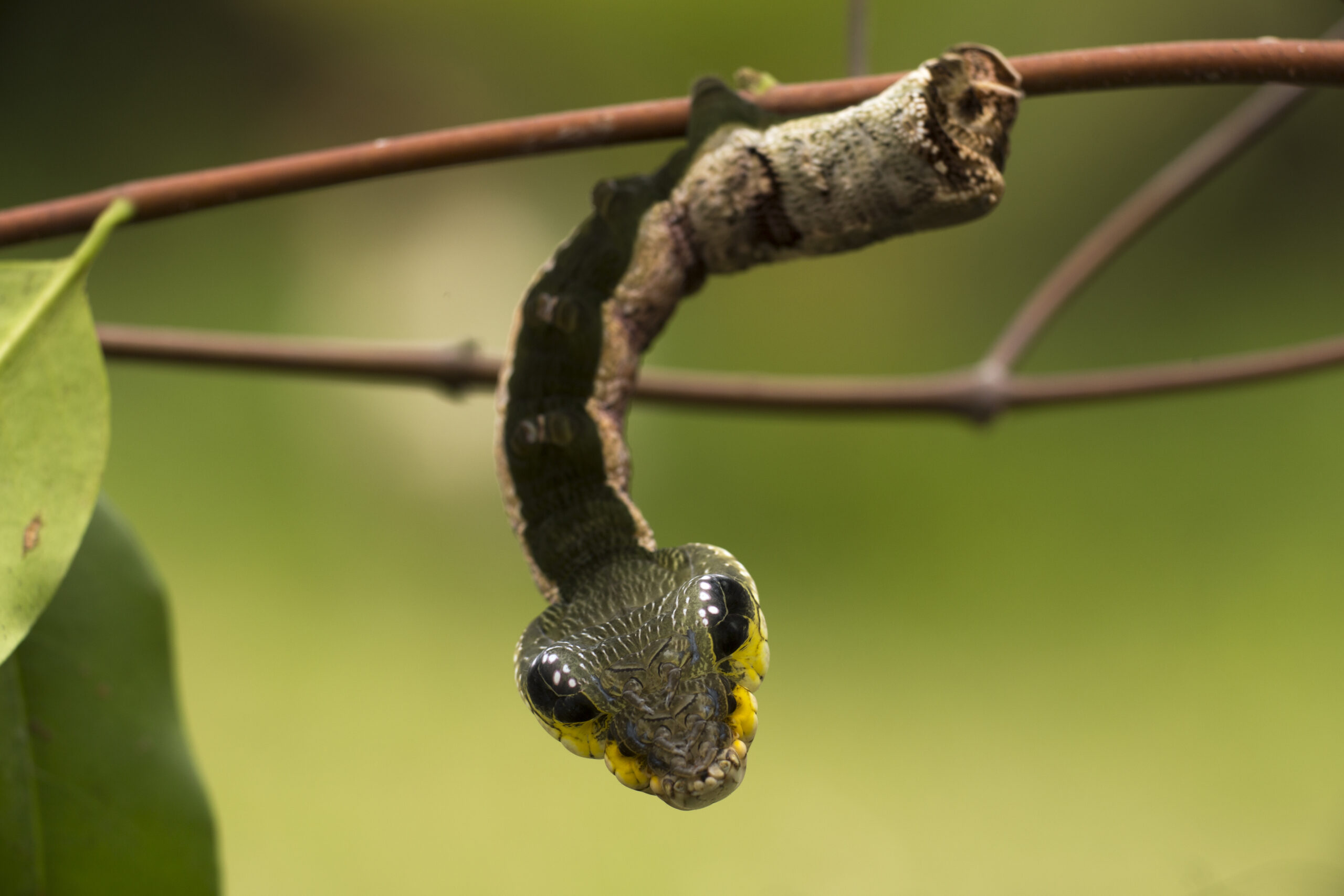 Key fact: during the display, the “snake head” is formed by the caterpillar’s enlarged front body segments while the real head is tucked down and largely hidden.
